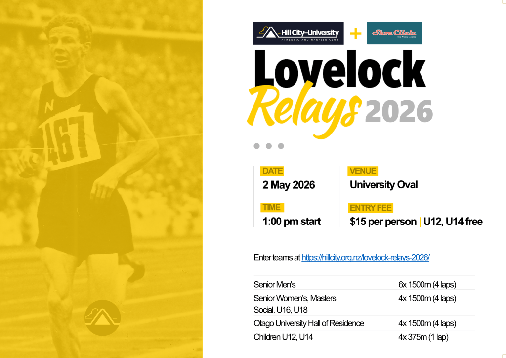 Mixed relay events (U16/18 and Otago University Residential College) require at least two female team members to be eligible.